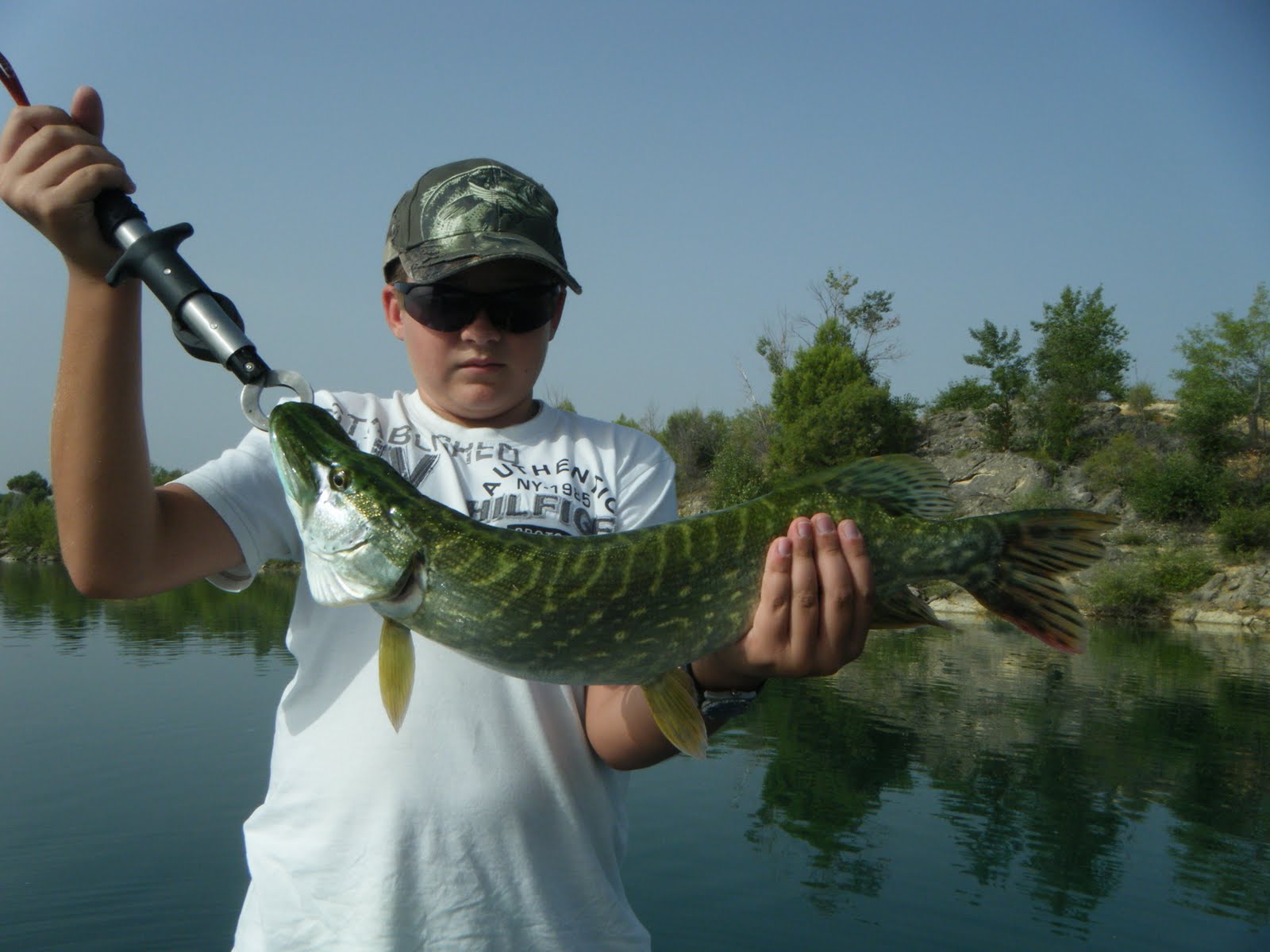 Poco a poco fueron saliendo los primeros lucios, bastante pequeños que para ser exactos su hubiesen sido una trucha común no habrían dado la talla, pero se tiraban a los señuelos con unas ganas locas….. los bases desaparecidos en combate……. Las lucio-percas también….. Después de pescar durante más de dos horas en aguas someras a primera hora de la mañana, decidimos irnos a unos cortados ya que la temperatura iba subiendo poco a poco…..los peces que nos daban la sonda se encontraban entorno a los 8 y 10 metros y aquí empezaron a salir las capturas reseñables del día…..7 lucios y 1 lucio-perca todos entorno a los 3 y 5 kilos y fijaos si empleamos señuelos….TODOS SALIERON CON EL MISMO: